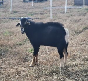 JJ was born 3/6/2025and weighted in at 6.5lbs. As of 9/4/25 he totaled out at 85lbs.He was twin of TMK OUTTA THE BLUE over WOK CALLIE (daughter of TAY ONYX). I bred him to 5 of our younger does for a late March kidding.